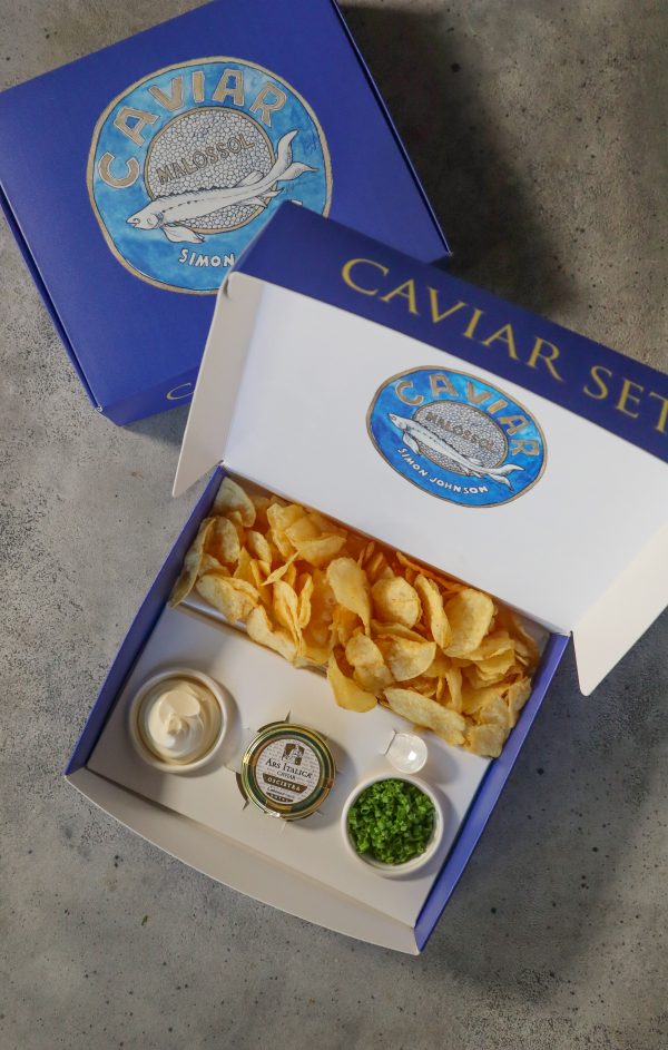 Crispy Bret’s chips, Coppertree Farm crème fraîche, fresh chives, and your choice of a 30g tin of sustainably certified Caviar, all elegantly packed and ready to enjoy.